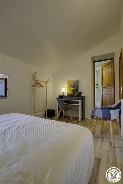 Au cœur d'un hameau de Servignat, en pleine campagne, Emmanuel vous propose 3 chambres d'hôtes à la décoration douce et épurée, situées à l'étage, et dans le prolongement de la résidence des propriétaires. Dans cette ancienne ferme bressanne entièrement rénovée, par une entrée indépendante, vous accédez sur une pièce de vie, depuis laquelle l'accès aux chambres se fait par un escalier. Le palier s'ouvre sur la première chambre composée d'un lit double en 160*200, la deuxième chambre est équipée d'un lit en 160*200 et d'un lit simple (adapté pour un enfant) et enfin la dernière chambre comprend un lit double en 160. Toutes les chambres disposent d'un bureau et d'une salle d'eau avec WC privative à la chambre. Les petits déjeuners et la table d'hôtes (sur réservation) élaborés avec des produits locaux et faits maison, sont pris sur la terrasse couverte l'été ou dans l'espace repas destiné aux hôtes. Un salon de détente, surplombant le séjour, est équipé d'un coin bibliothèque, afin de prendre le temps à la rêverie . Pour une halte ou un séjour plus long, le parc arboré est conçu, pour se détente, faire des siestes, à l'ombre, dans les hamacs, transats et profiter du calme des lieux. Proche de la chambre : Base de Loisirs de Montrevel (15km), Port de plaisance de Pont de Vaux (10km), de nombreux sentiers pédestres, pour les vélos : Voie Bleue (10km) et Traversée (1,5km) et de nombreux circuits … sans oublier la pêche en rivière, étang ou ruisseaux. Faites le plein d'activité, que vous soyez petits ou grands, vous trouverez forcément votre bonheur. Le remplissage de l'eau de la piscine et son usage par les locataires peuvent être restreints en application des arrêtés « sécheresse » de la préfecture de l'Ain.