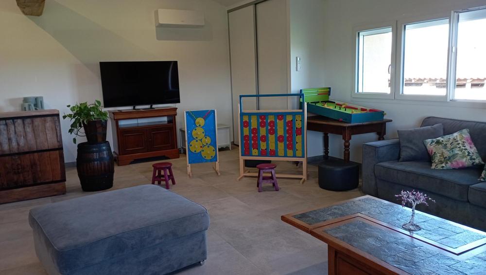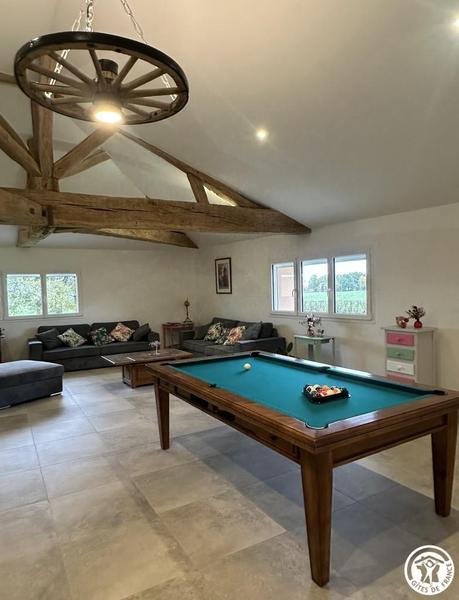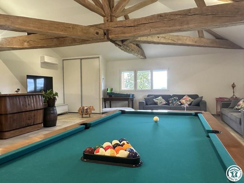 Une grande pièce de vie lumineuse et une pièce maitresse au 1er étage. Levez la tête et admirez cette charpente qui surplombe cette pièce de détente avec billard. La propriétaire a mis sa touche de couleur : mauve est sa préférée, mais vous aurez du bleu, moutarde, gris, etc…