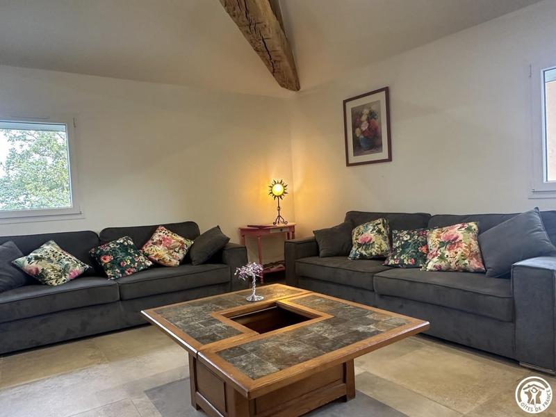 Chauffage pompe à chaleur et bois. Terrasse située derrière le gîte sans vis à vis. Mitoyen à un gîte de 2 personnes et à un porche couvert.