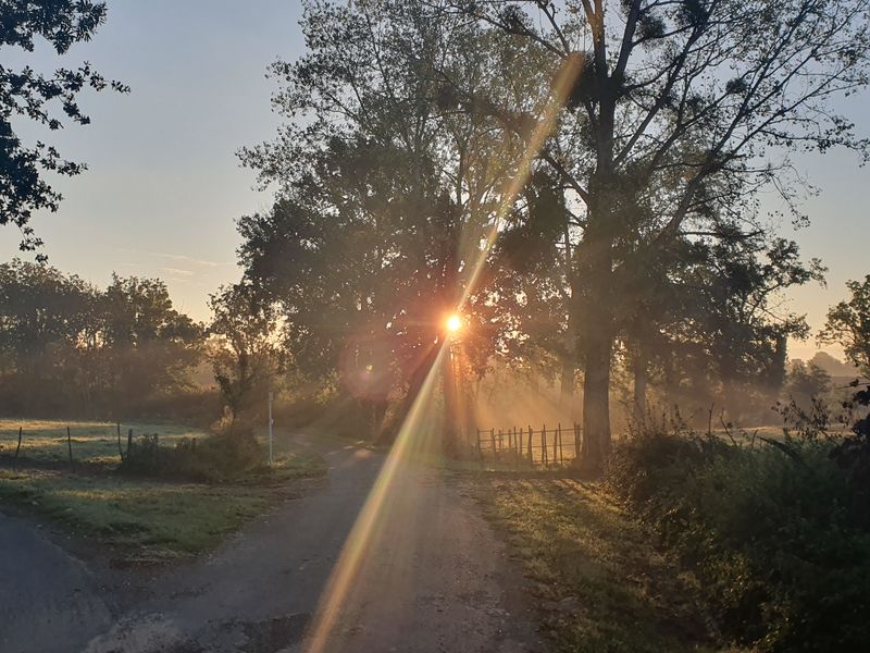 (D/A) Dos à la mairie, partir à gauche et passer devant l'école. Au carrefour à l'angle de cette dernière, tourner à gauche, puis encore à gauche à la sortie du virage. Couper une route pour arriver à la D2.
