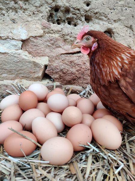 Fruits et produits transformés réalisés avec nos fruits, oeufs, pain cuit au feu de bois et brioches réalisés avec les céréales cultivées sur l'exploitation.