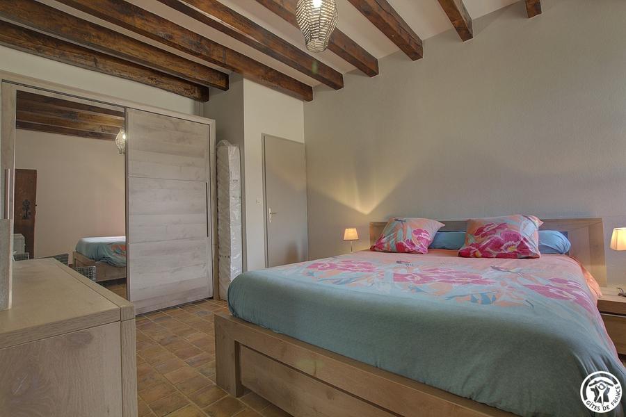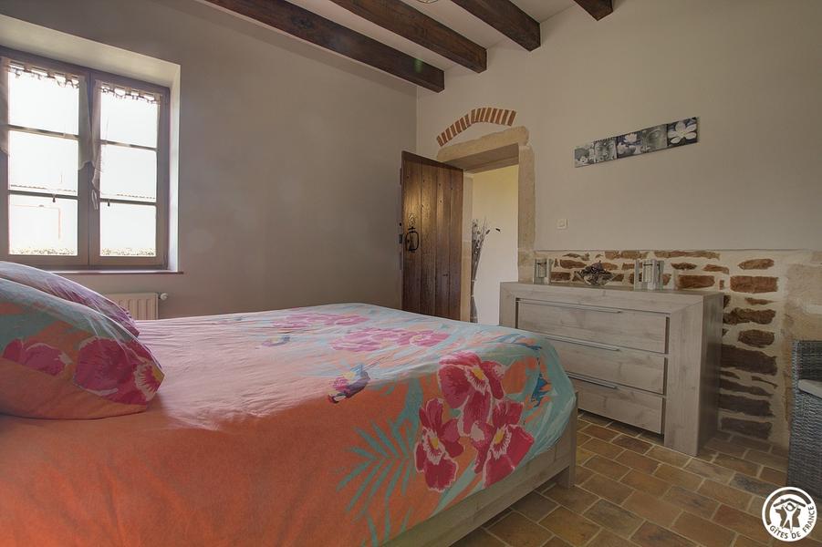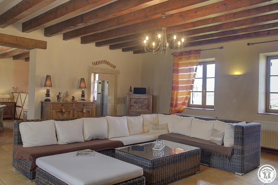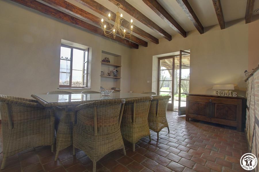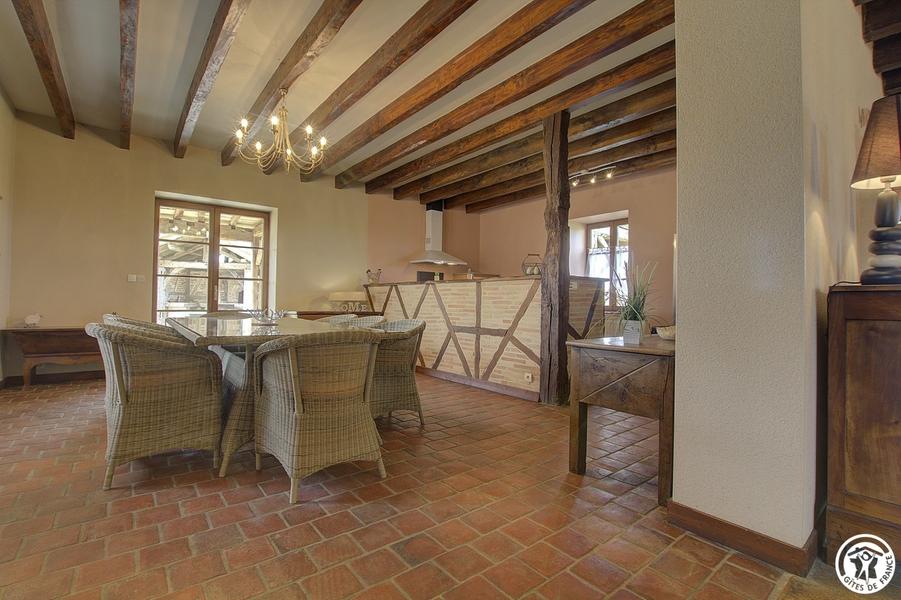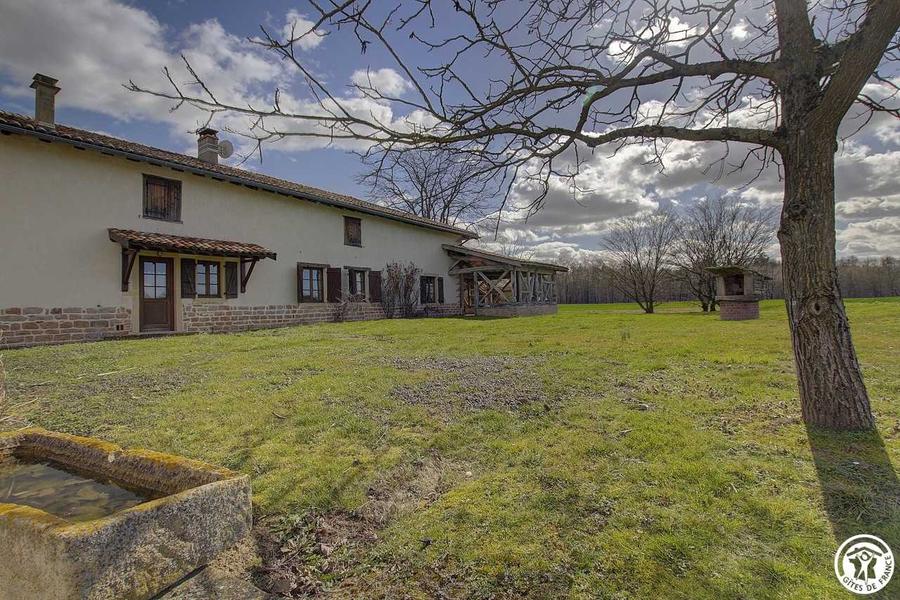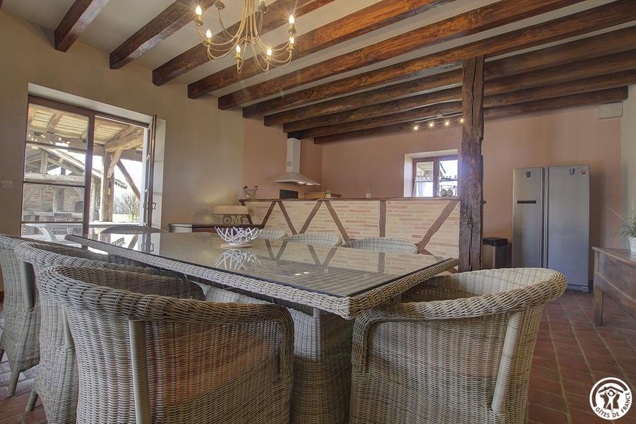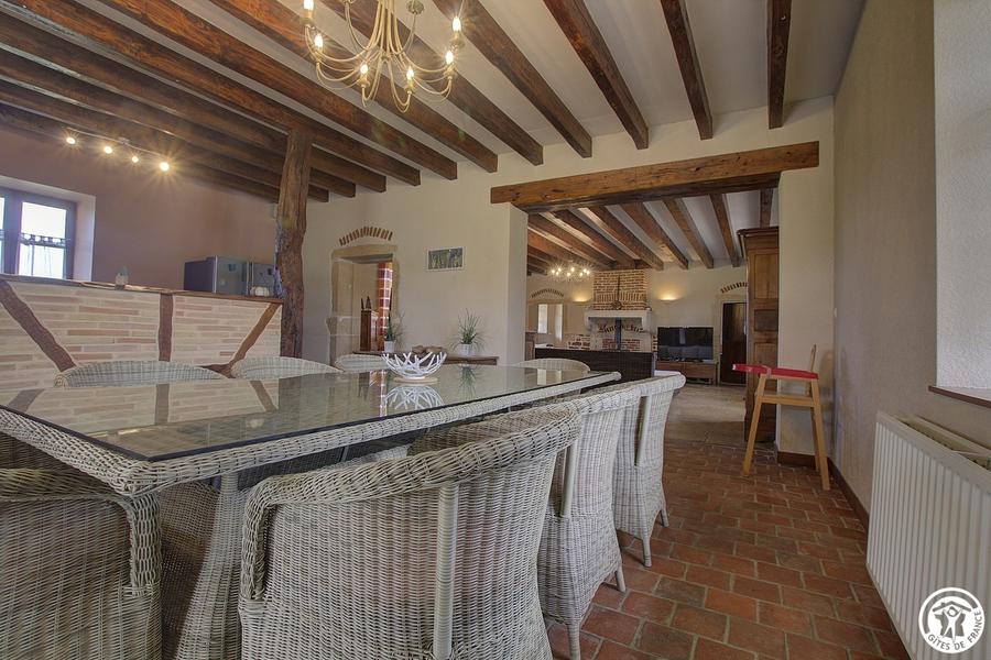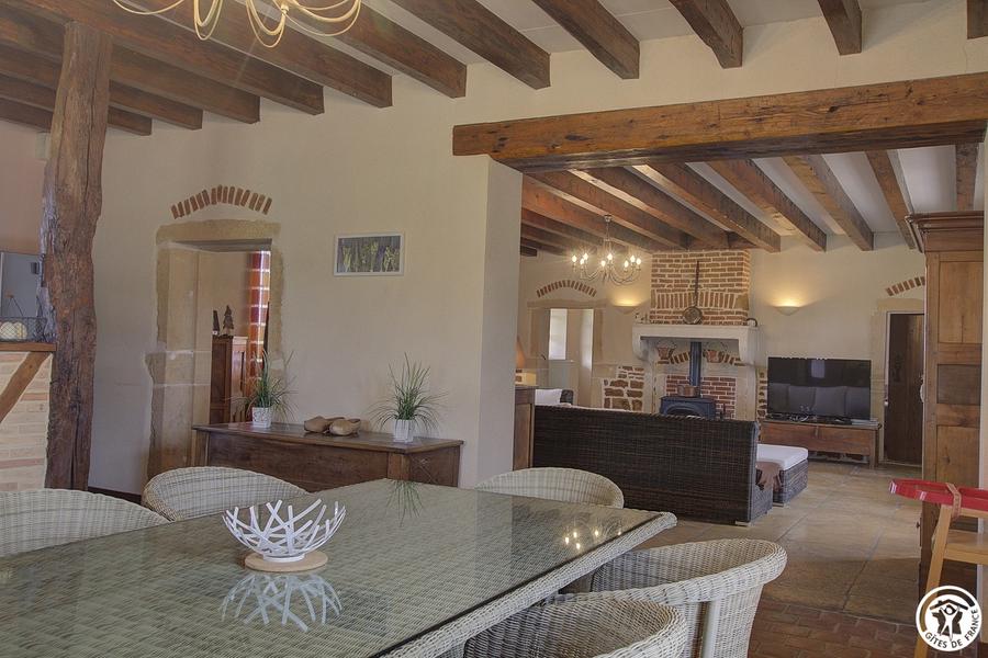 Gîte indépendant (135m²), plain-pied, situé dans un ancien corps de ferme restauré dans le style Bressan. Cuisine ouverte sur séjour, grand salon. Trois chambres (1 lit 160, 1 lit 140 et 2 lits 90 gigogne), salle d'eau, WC indépendant. Chauff. gaz et bois