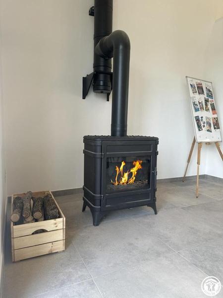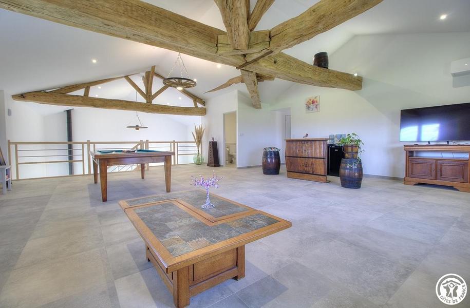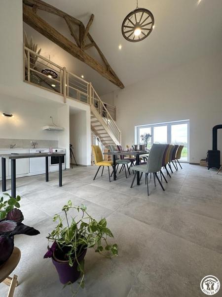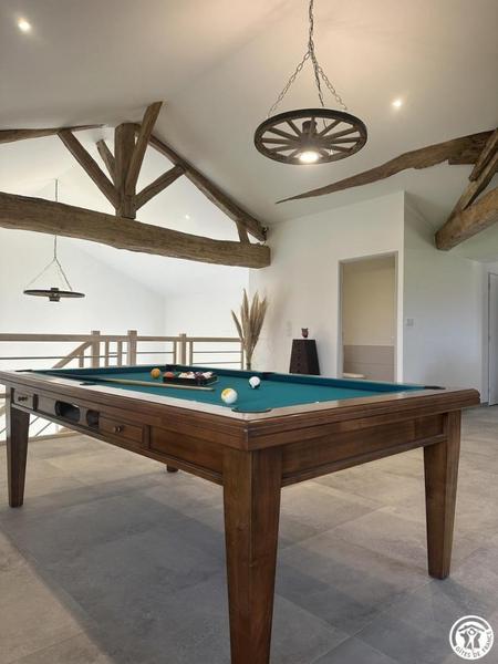 Découvrez une grande pièce de vie lumineuse. Levez la tête et admirez l'imposante charpente qui surplombe le salon avec billard. Des chambres lumineuses, spacieuses, aux touches colorées : mauve, orange, bleu, … Lors des soirées plus fraiches, rien de tel que se réchauffer près du poêle à bois….