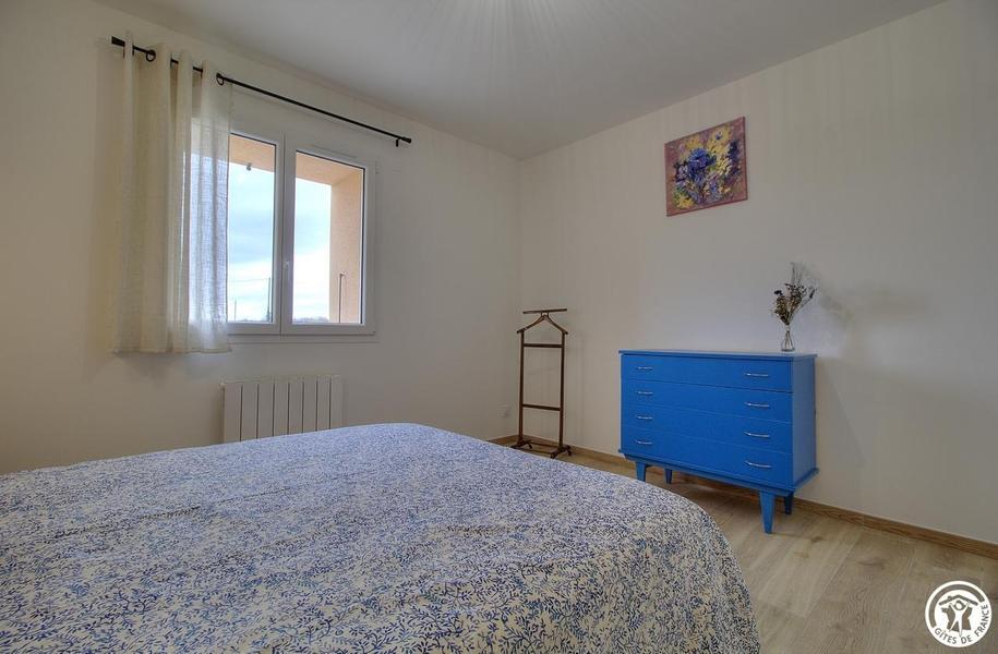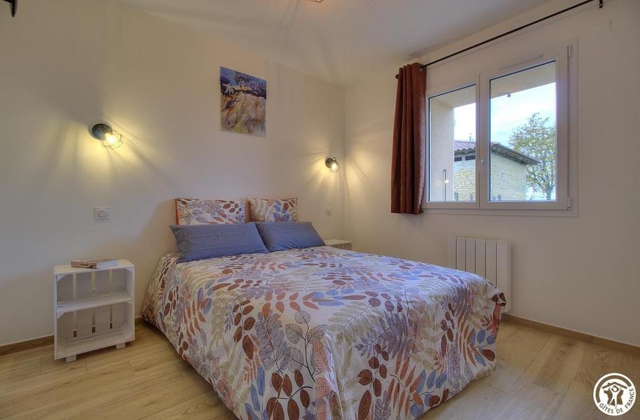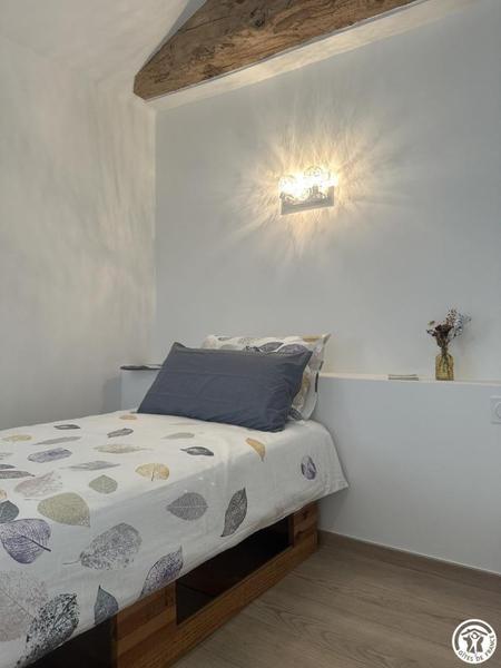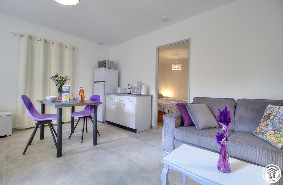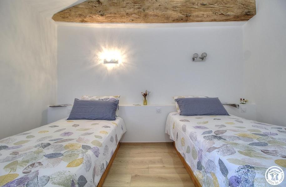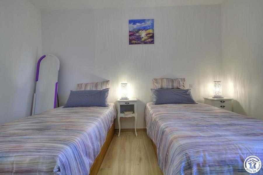 Dans le petit mitoyen et de plain pied : cuisine salon, chambre avec deux lits (90*190) salle d'eau avec WC.