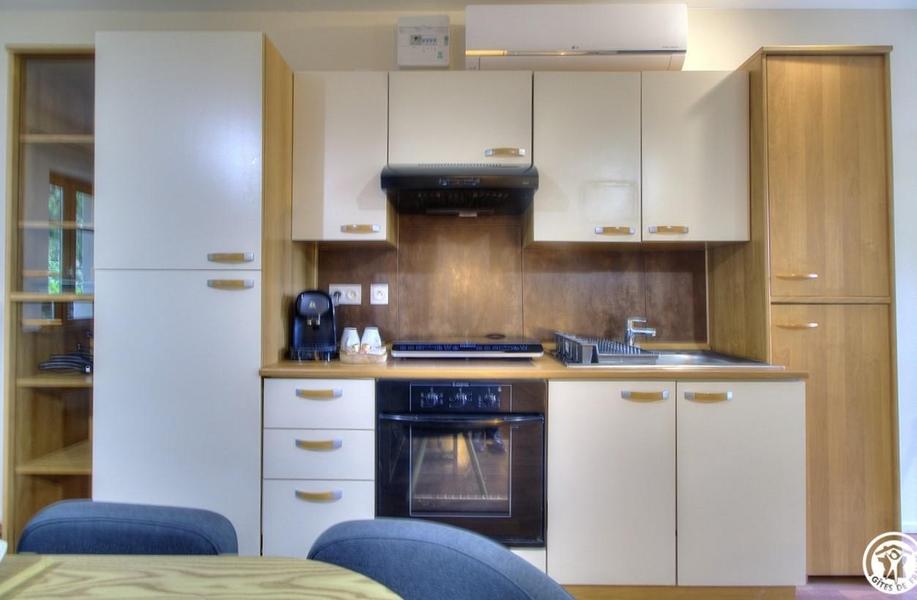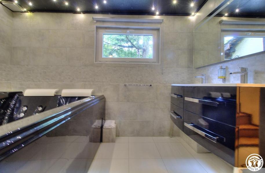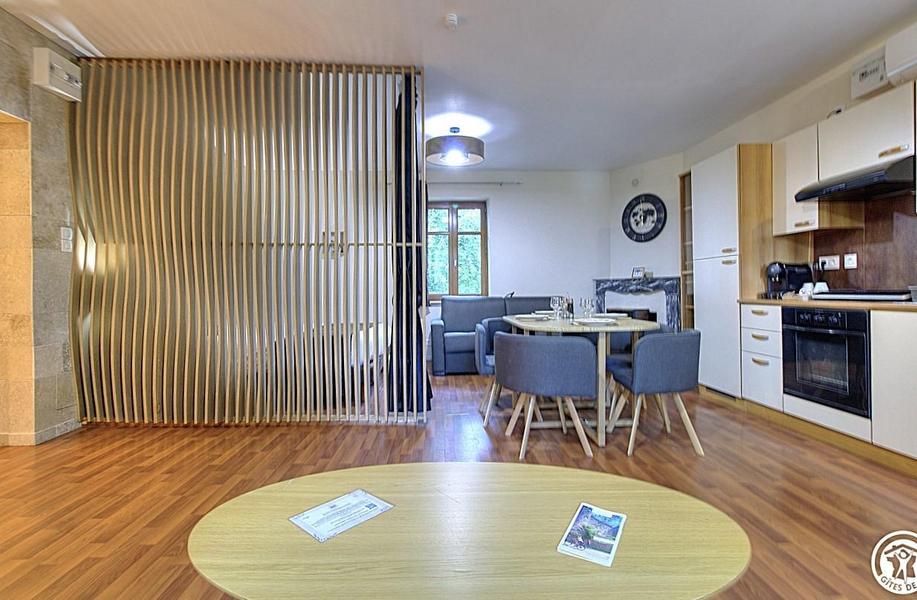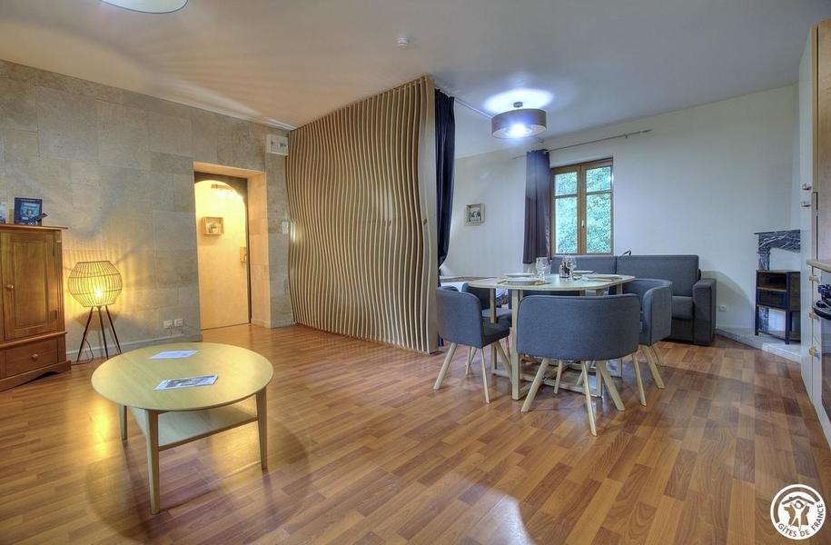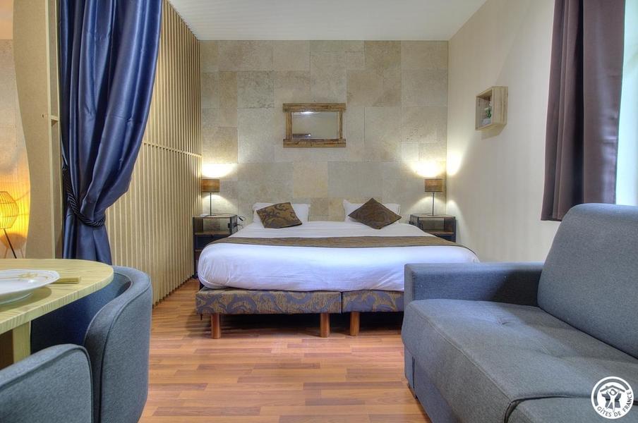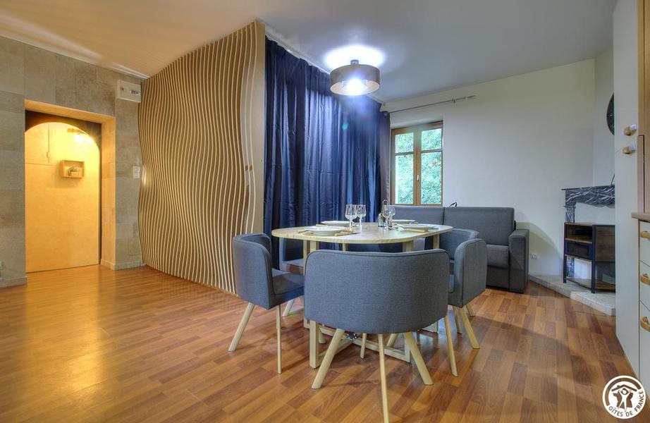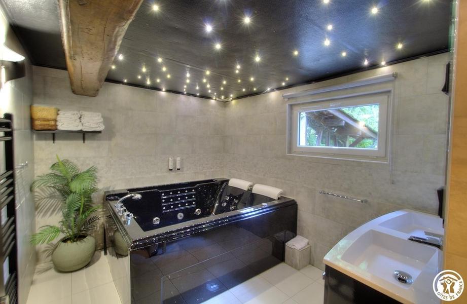 Votre logement : grand studio avec cuisine-salon, 2 lits simples dans un coin nuit, et canapé-lit. 4 marches pour descendre vers une salle de bain équipée d’un bain bouillonnant, accompagné de luminothérapie, et de musique sans oublié un plafond étoilé pour une véritable parenthèse de bien-être. WC séparés.