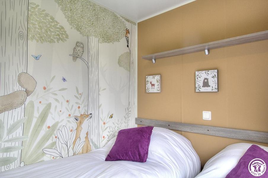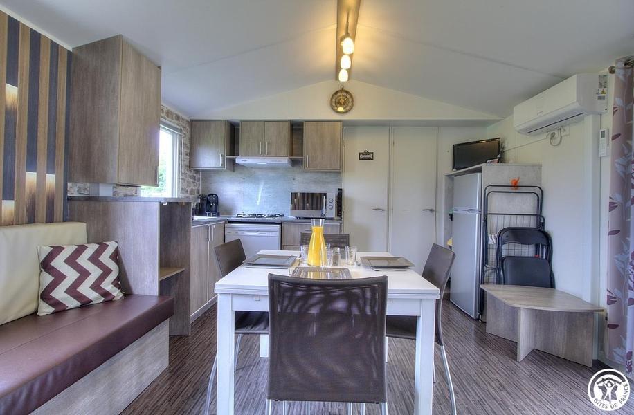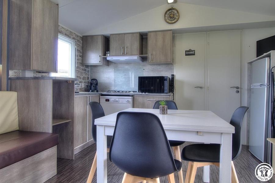 Le mobil-home se compose d’une pièce de vie lumineuse avec coin repas et cuisine équipée, de 3 chambres (une avec un lit 140×190 et deux avec deux lits simples 80×190), salle d’eau et WC séparés. Chaque espace a été conçu pour offrir confort, simplicité et praticité. À l’extérieur, la grande terrasse abritée est idéale pour savourer les repas à l’ombre ou partager un moment convivial en plein air. La piscine chauffée de la propriété, accessible à l’ensemble des hôtes, offre un agréable moment de fraîcheur pendant les journées estivales. Les petits pourront également se dépenser sur l'aire de jeux sécurisé à côté du logement;