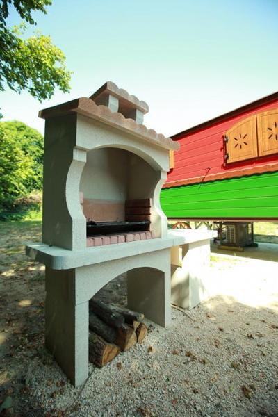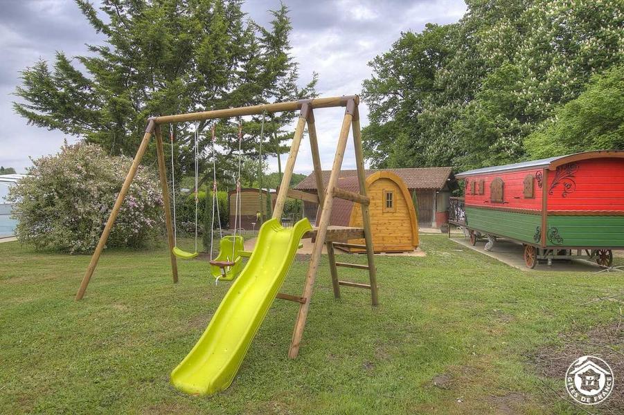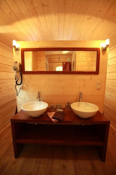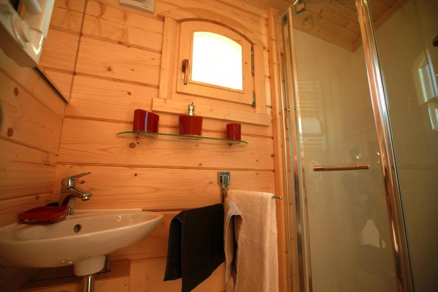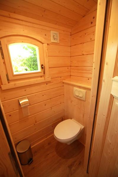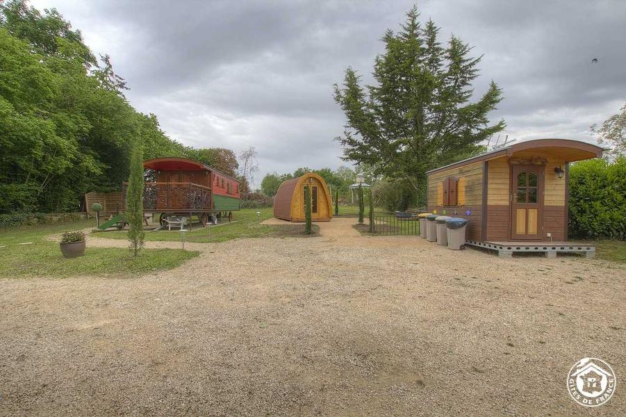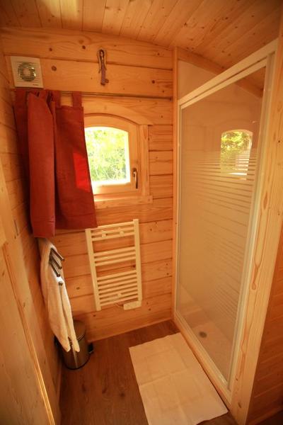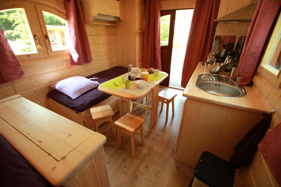 La roulotte "Romantic" est équipée d'un espace kitchenette avec un coin détente comprenant un lit gigogne (2 lits en 80*190) et un lit double (160*200) avec écran plat intégré. Un coin toilette comprenant deux vasques avec douche fermée et wc indépendant. Vous profitez pleinement du calme des lieux et du paysage grâce à la terrasse (7.50 m²) intégrée. Accès à une roulotte séparée (espace buanderie) avec lave-linge commun aux deux roulottes et la piscine couverte des propriétaires mise à la disposition des hôtes sous conditions. Chauffage électrique avec climatisation intégrée.